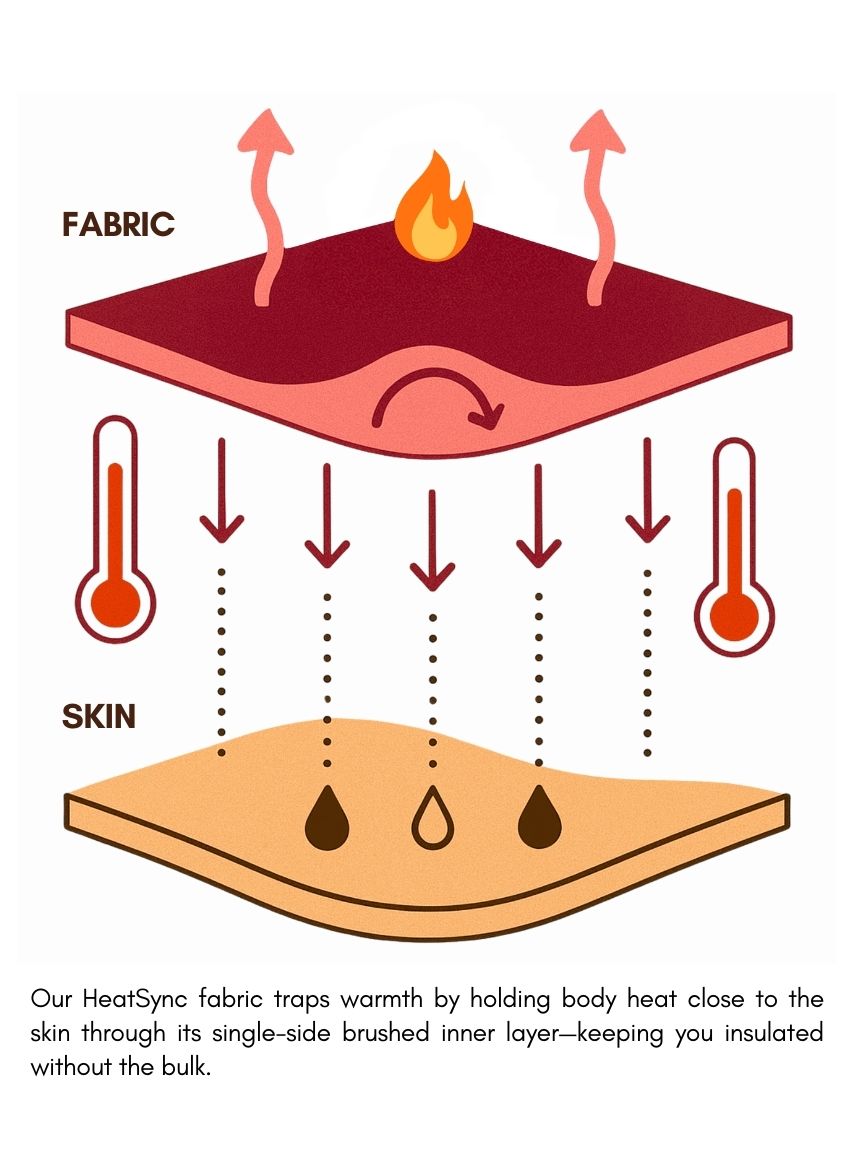 Where science meets comfort. Our new-age thermal technology converts your body’s natural energy into gentle, lasting warmth. Brushed for softness, engineered for movement, and tested for real thermal retention — it adapts, breathes, and moves as naturally as you do.